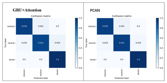 The GRU + Attention Concat method can correctly identify all Bored categories, and the accuracy rate of Interest category identification is 93.90%, and the proportion of confusion with Neutral category is 6.10%. However, the recognition accuracy of the Neutral category is only 91.20%, and the confusion rate between this category and the Bored category is relatively large, at 5.90%. The confusion ratio for the Interest category accounts for 2.90%. However, 6.10% of the sample data of the Interest category are identified as the Neutral category, so it can be seen that neutral emotions are not easy to identify, and network models easily identify neutral emotions as the Bored category. In comparison, PCAN’s recognition accuracy of neutrality reached 94.1%, which effectively reduced the confusion rate between this category and the Bored category, accounting for 2.90%. Whereas, PCAN’s learning efficiency for stitched features was low, with the reasoning speed of the network being 0.20 s per epoch. The emotion recognition accuracy improved by only 0.59% compared to the cascade attention-based model, and by 0.31% compared to Random Forest. These results demonstrate that parallel-connected attention aggregation networks exhibit relatively weak fusion capabilities for concatenated features. When concatenated features are introduced into the network, the network fails to fully extract and leverage the benefits of both video signal data and PPG signal features using local and global attention, consequently resulting in only a marginal improvement in emotion recognition accuracy. Therefore, we mainly consider the PCAN Add method. When employing the PCAN (Add) approach, the multi-scale attention module within the parallel-connected attention aggregation network effectively manages the dependency correlations between the dual-modal data. As a result, the accuracy of emotion recognition reaches 95.75%, which is a 1.79% improvement over Random Forest classification methods and a 2.07% advancement over single-mode video data.