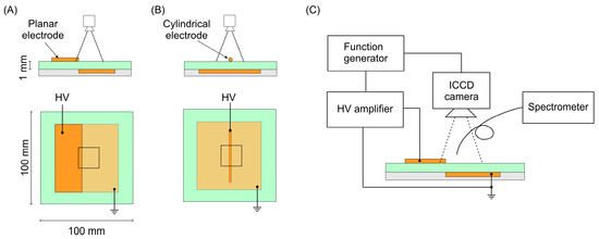 The time-resolved imaging and OES experiments were carried out using two types of SDBD reactors. The first reactor had a planar high voltage electrode cut into a rectangular shape and made of 20 µm thick copper foil, while the other reactor had a cylindrical electrode made of a thin tungsten wire with a diameter of 10 µm. In both cases, the electrode was placed on a dielectric barrier made of a 1 mm thick ceramic plate (100 mm × 100 mm). The grounded electrode was placed on the opposite side of the dielectric. The relative positioning of the electrodes on each side of the dielectric is shown in Figure 1. In the planar electrode configuration, the high-voltage electrode was aligned edge-to-edge with the grounded electrode (Figure 1A), while the wire electrode was positioned to extend halfway across the grounded electrode (Figure 1B). The grounded electrode was electrically insulated with resin. The experiment was conducted in ambient air.