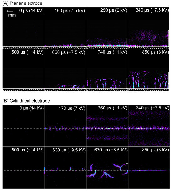 Typical sets of time-resolved images illustrating the evolution of the discharge plasma during a single duty cycle generated using the planar and cylindrical electrode reactors are shown in Figure 2. Each image in the set was captured at a progressively increasing time delay relative to the maximum of the voltage waveform. The specific time delay and corresponding voltage are given in each image.