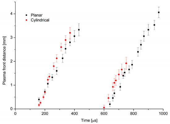 The recorded images allowed us to characterize the propagation of the plasma front in both discharge modes (Figure 3). The pseudo-Trichel discharge lasted approximately 250 µs for both electrode configurations, during which the plasma front advanced up to about 3.3 mm from the electrode. In contrast, the duration of the streamer phase varied: it lasted 350 µs for the planar electrode reactor, allowing the plasma to travel about 4 mm in this time, while for the cylindrical electrode reactor, this phase lasted only 160 µs, with the plasma front traveling only about 2 mm. Thus, while the cylindrical electrode partially suppresses positive streamer formation, it does not completely eliminate it. We found it interesting that the average plasma front velocity was approximately the same for both discharge modes and both reactor types, ranging from 12 to 15 m/s. This plasma front velocity differs from the results previously obtained by Enloe et al. [28], who reported approximately 85 m/s. These differences may be due to the higher frequency of the voltage waveform in their experiment, which resulted in a more rapid increase in the voltage applied to the electrode.