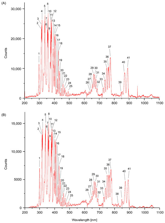 The emission spectra of excited atoms and molecules in the SDBD plasma were first measured using the OceanOptics Maya 2000 spectrometer, which covers a broad spectral range from 200 nm to 1100 nm. Figure 4A,B shows typical emission spectra (averaged over 60 s) recorded for reactors with planar and cylindrical electrodes, respectively. Emission peaks and bands were identified and are summarized in Table 1.