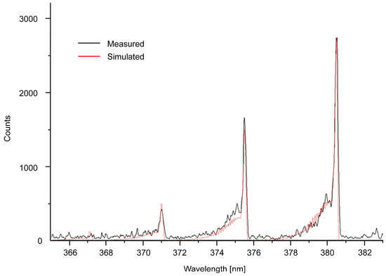 As shown elsewhere [50,51], the DBD plasma does not reach local thermodynamic equilibrium, so a simple Boltzmann plot method [52,53] cannot be directly applied to determine its thermodynamic parameters. Instead, we used the Specair software (version 3.0.2.0) to simulate the N2 emission spectrum at given rotational (Trot), translational (TTrans), vibrational (Tvib), and electron (Te) temperatures, and fit the simulated spectrum to the measured one. However, we found that the spectral resolution of the Maya 2000 spectrograms was too low for reliable spectral fitting, so we re-measured the plasma emission spectrum using an Andor Mechelle 500 high-resolution spectrometer. Because of its relatively low sensitivity and nonlinear response over a wide spectral range, we limited its spectral range to approximately 365–384 nm, where only strong N2 bands are present. This limited range also minimized simulation errors due to software limitations, such as the lack of consideration of plasma optical thickness and air absorption. In the simulations, we assumed that the plasma contained only nitrogen and that only the second positive nitrogen transitions occurred in the plasma.