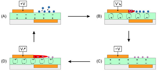We begin the analysis at the positive voltage half-cycle, when the voltage applied to the discharge electrode is at its maximum (Figure 6A). At this phase, the material of the dielectric barrier is already electrically polarized so that the negative-bound charge accumulates near its upper surface. This negative-bound charge electrostatically attracts positive charges from the surrounding air, forming a thin layer of positive charges on the dielectric surface. Although the attraction of these positive charges has been reported in other studies [56,57,58], the mechanism behind their generation remains partially unexplained. It is likely that these charges consist of positive gas ions produced in the discharge during the previous voltage cycles. In Section 3.2, we confirmed the presence of N2+ ions in the SDBD plasma (using the OES method), which are produced in the discharge by collisions with energetic free electrons, as described with Reaction (1).