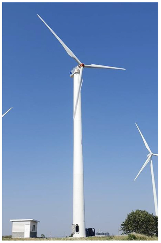 The wind turbine targeted in this study is a 100 kW turbine designed and manufactured for commercial use, which is currently undergoing installation and system optimization for field validation. Additionally, this wind turbine is designed with three blades to enable integrated pitch control and has a mechanism similar to that of typical large wind turbines. Its specifications include a hub height of 30 m, a rotor diameter of 24 m, a rated rotor speed of 50 rpm, and a maximum power coefficient of approximately 0.45 at a TSR of 7.3. Figure 1 shows the shape of the targeted wind turbine, and Table 1 presents its brief specifications. Wind turbine modeling was performed using commercial software based on the specifications provided by the manufacturer.