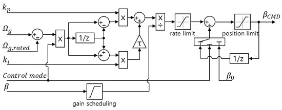 The power control of the targeted wind turbine, which is managed by the PLC, was designed to apply only pitch control. Typically, the pitch control of a wind turbine operates to maintain rated power in regions exceeding the rated wind speed, such as Region III. Pitch control uses PI or Proportional–Integral–Derivative (PID) control to maintain the rated generator speed, and this study adopted PI control [12,13]. Figure 3 shows the structure of the pitch PI control, where the measured generator speed and the error from the rated generator speed serve as inputs for the PI control. In this case, the control mode is input as a value of 0 or 1 based on the output of the mode switch logic for control mode transitions. When 0 is input, the control algorithm perceives the current operating condition as Region II and calculates the fine pitch angle to be transmitted as the pitch command. Conversely, when 1 is input, it recognizes the current operating condition as Region III and transmits the pitch command calculated through the PI control [13].