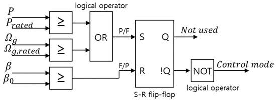 The control transition logic uses the current operating state of the wind turbine to determine and decide on the appropriate control mode. The mode switch applied in previous studies utilizes feedback from the rated power, measured generator power, rated generator speed, measured generator speed, fine pitch angle, and measured pitch angle to assess the control mode [13]. Figure 4 shows the structure of the mode switch. The S-R flip-flop logic circuit receives an input signal of 0 or 1, determined by the operating state of the wind turbine, and generates an output signal of 0 or 1 based on the truth table presented in Table 2. The output signal passes through a NOT logic gate and is output as the final value of the mode switch, where 0 corresponds to Region II and 1 corresponds to Region III, thus contributing to the execution of control based on these operating regions. However, the mode switch has limitations, as it causes a sudden decrease in generator torque and generator power at the moment of transition from pitch control to torque control. Although the application of the PCS torque control alleviates the tendency for a sudden decrease in generator torque and power, it still shows a persistent tendency for reduction across the entire operational range. To overcome these limitations, the previously proposed Set Point Smoother (SPS) was modified and applied [29], and the design process excluded torque control, focusing solely on pitch control.