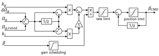 Equation (1) shows the formula for calculating the change in the generator speed used in the design of the SPS, utilizing the rated generator torque, measured generator torque, gain value, and rated generator speed as inputs. The change in the generator speed is used to calculate the error value for the pitch PI control. Typically, the error applied in the pitch PI control is calculated as the difference between the rated generator speed and the measured generator speed. However, by adding the change in the generator speed to the error calculation term, the error value can be altered, thereby changing the pitch control commands. Figure 5 illustrates the overall schematic of the power control algorithm with the modified control transition logic applied. Equation (2) presents the formula for error calculation, and the structure of the pitch PI control is modified and applied as shown in Figure 3 and Figure 6.