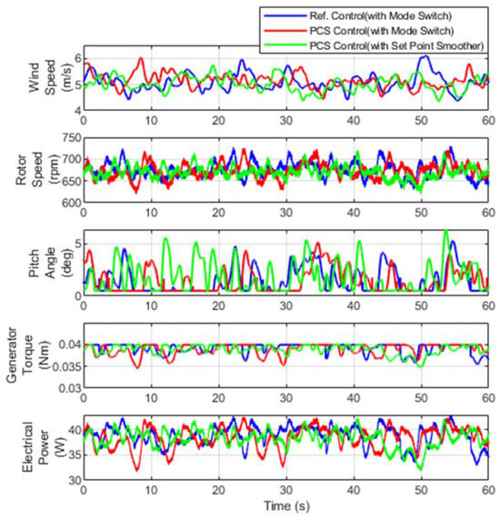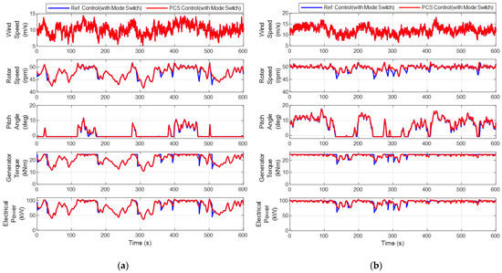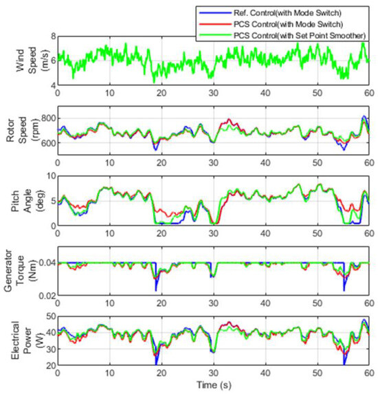 Figure 11 shows the simulation results for the reference power control, PCS torque control, and control switching logic control. Similarly, it can be observed that the generator torque value is predominantly influenced by the rotor speed due to the consideration of the PCS torque control. The proposed control algorithm alleviated the sharp drop in the generator torque observed in the reference power control. However, while the reference power control maintains the generator torque value consistently at the rated value in Region III, the PCS torque control exhibits variable values depending on the rotor speed. This has resulted in an increase in the standard deviation of both the generator torque and the power.