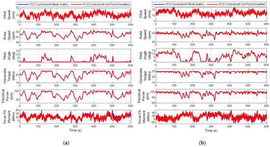Performance comparison of the power control considering the mode switch and Set Point Smoother in the independent generator torque control. (a) Simulation results under average wind speed conditions of 10 m/s; (b) Simulation results under average wind speed conditions of 12 m/s.