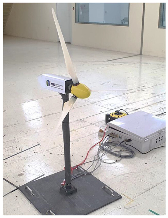 To experimentally validate the proposed power control, wind tunnel tests were conducted. The wind tunnel experiments utilized a scaled wind turbine with a rated power of 39.7 W, which was designed and developed through previous research [30]. The blades, hub, tower, and other components of the scaled wind turbine model used in this study were manufactured in South Korea [31]. The wind turbine model features three blades and has a mechanism similar to that of conventional large wind turbines. Considering the operating mechanism akin to that of large wind turbines, the scaled wind turbine model was deemed suitable for experimentally validating the proposed control algorithm. Figure 9 shows the shape of the scaled wind turbine, while Table 6 presents a summary of its specifications.