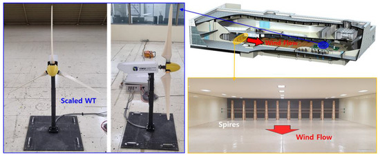 The wind tunnel tests were conducted at the wind tunnel center located at Jeonbuk National University in South Korea. Figure 10 illustrates the experimental setup and the wind turbine testing environment for the target wind tunnel experiment. The wind generation space created by the wind generation device has a length of approximately 40 m in the wind direction and about 12 m in the vertical direction of the wind. The proposed control algorithm was designed to have the same structure as the scaled wind turbine model and was uploaded via commercial PLC programming. Additionally, the setup was configured to allow for data verification and storage through remote monitoring.