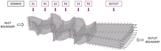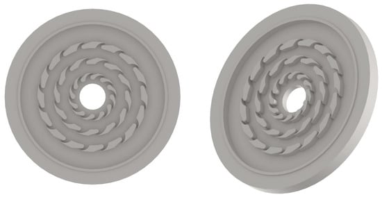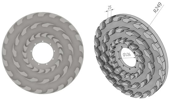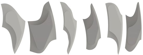 In order to prepare the computational model for analysis, a detailed examination of the provided turbine geometry was conducted. The centrifugal radial turbine’s flow system is comprised of two fundamental components: the stationary stator (Figure 1) and the rotating rotor (Figure 2). Both components are of critical importance in defining the flow characteristics and overall performance of the turbine. The stator and rotor are composed of three distinct stages (Figure 3), each featuring a varying number of blades. The initial stage comprises 12, 18, and 24 blades, while the subsequent stage incorporates 12 and 15 blades. The final stage is characterized by 16 and 21 blades. The variation in blade count and blade geometry across stages is designed to manage the changing flow velocities and pressures throughout the turbine. A clearance of 0.2 mm has been defined for the tips situated in both the stator and rotor rows.