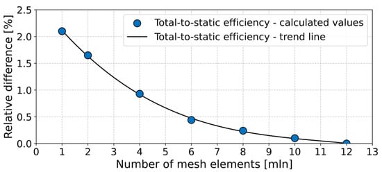 These parameters were selected with great care in order to optimize the quality of the mesh. The application of face angle limits serves to circumvent the potential for numerical inaccuracies that may arise from the presence of highly skewed elements. By establishing a maximum face angle of 165° and a minimum of 15°, the mesh is configured to retain element shapes that facilitate stable and accurate computations. The edge length ratio limit of 500 ensures that elements do not become excessively elongated, which can have a detrimental impact on convergence and solution accuracy. The volume ratio limits regulate the variation in element size between adjacent elements, facilitating a seamless transition in element sizes throughout the mesh. Setting the connectivity number to 12 helps maintain an optimal number of elements connected to a node, reducing computational errors associated with highly connected nodes. The mesh quality criteria were implemented with the objective of achieving a balance between computational efficiency and the accuracy of the simulation results, thereby ensuring reliable predictions of the turbine performance. The radial turbine flow path was calculated on a fine grid comprising approximately eight million elements. In the course of grid independence checks, grids of up to 12 million elements per whole passage were investigated. It was found that the maximum relative differences between corresponding values of isentropic efficiency for the finest investigated mesh of 12 million nodes (reference values), with respect to those of the mesh of 8 million nodes calculated, were less than 0.25% (Figure 4).