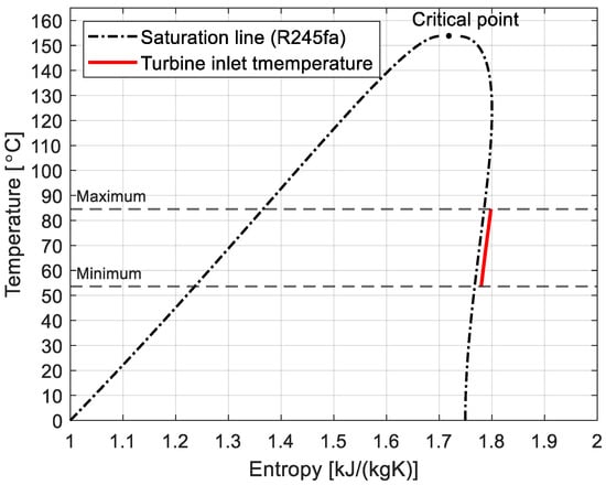 A series of simulations were conducted across the range of inlet and outlet pressures to evaluate the turbine’s performance under various operating conditions. This approach allowed for the assessment of the turbine’s adaptability to fluctuating waste heat sources and the identification of any performance limitations when operating beyond the design point. The operating conditions were established to reflect the turbine’s operation beyond the design point, with the objective of accommodating variable waste heat sources. The inlet pressure to the turbine was varied from 330 kPa to 780 kPa in order to simulate different operating scenarios, while the outlet pressure was set between 150 kPa and 200 kPa, in alignment with the analyzed condenser pressures in ORC systems. The temperature of the working fluid at the turbine inlet was determined using the saturation temperature corresponding to the specified inlet pressure (Figure 6). An additional superheat of 5 K was added to prevent condensation within the turbine, ensuring that the fluid remained in the superheated vapor region. The entropy of the working fluid was then calculated along the specified isobar for accurate thermodynamic property definition.