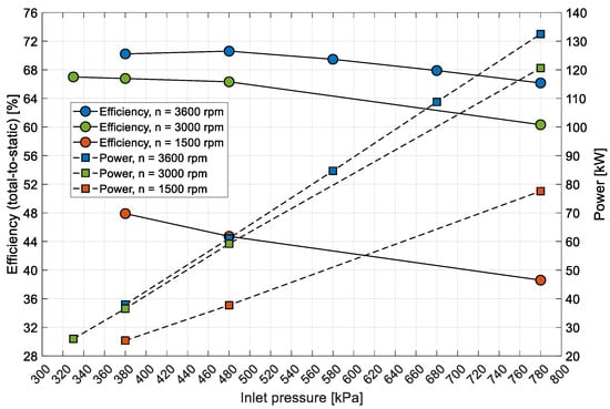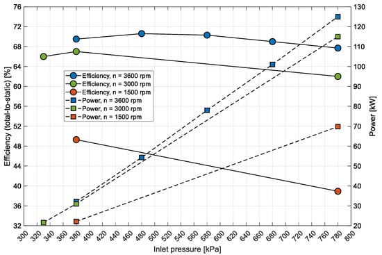 Comparison of efficiency and power output at varying inlet pressures and rotational speeds.