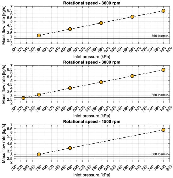 In order to evaluate the turbine’s regulatory capabilities and adapt the cycle parameters to its characteristics, the mass flow rate through the turbine was determined as a function of the inlet pressure (Figure 8). At an inlet pressure of 330 kPa, the mass flow rate was approximately 2.6 kg/s, increasing to nearly 6.3 kg/s at an inlet pressure of 780 kPa. The significant variation in mass flow rate with inlet pressure underscores the necessity for precise control of operating conditions to guarantee optimal turbine performance within the ORC system.