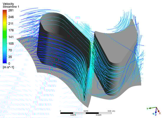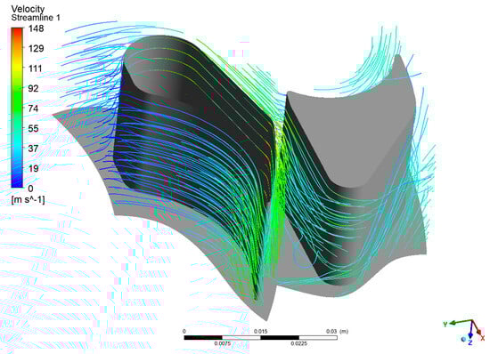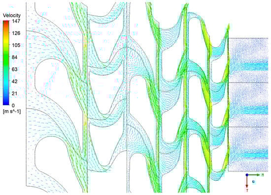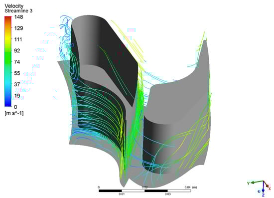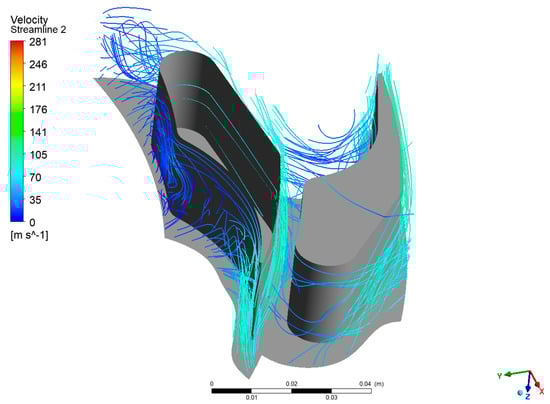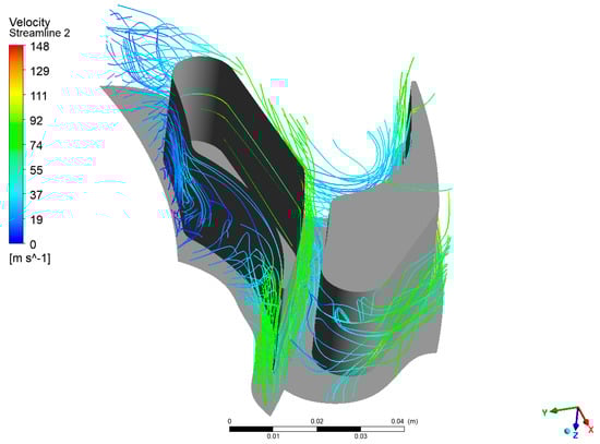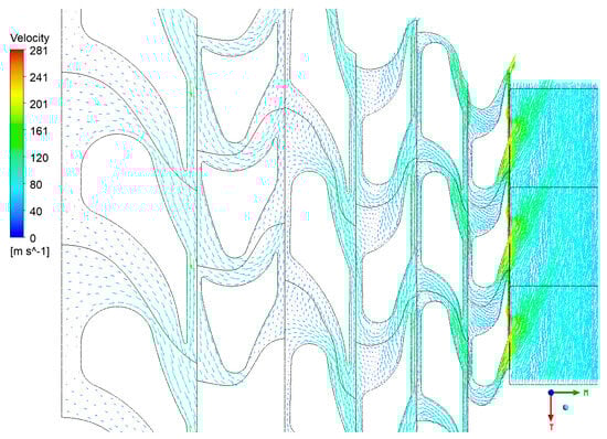 As with the previous case, this section presents the velocity vectors (Figure 16), streamlines (Figure 17, Figure 18 and Figure 19), and static entropy contours (Figure 20 and Figure 21) of the centrifugal turbine operating at an inlet pressure of 380 kPa and a rotational speed of 3000 rpm. The flow analysis under these conditions revealed a similar pattern of losses, as previously observed, namely, profile losses on the suction side of the rotor blades and edge losses on the stator blades of the second and third stages. It is noteworthy that the areas of the second and third stages of the turbine exhibited a notable intensification of losses. This increase in losses is particularly significant, as it indicates that the turbine’s performance deteriorates when operating at lower inlet pressures. The intensified losses may be attributed to enhanced flow separation, increased secondary flows, or other adverse flow phenomena that become more pronounced under these conditions. These findings emphasize the vulnerability of the second and third stages to alterations in operational parameters. The augmented losses underscore the necessity for prospective design modifications to the blade geometry or adjustments to the operational conditions to mitigate efficiency reductions. Addressing these issues is crucial for optimizing the turbine’s performance when operating beyond the design point, particularly in applications involving variable waste heat sources where inlet conditions can fluctuate significantly.