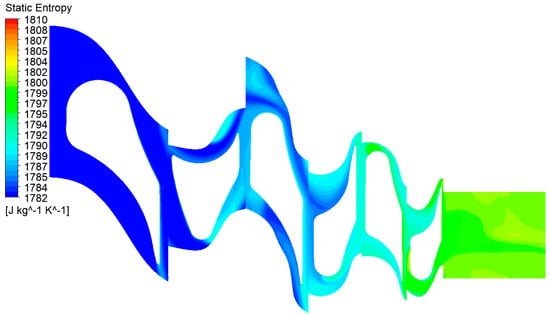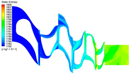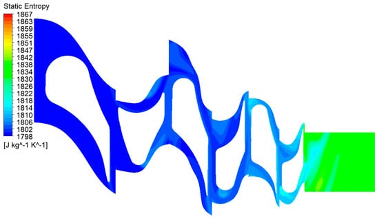 Static entropy contours in the turbine at the mid-span.