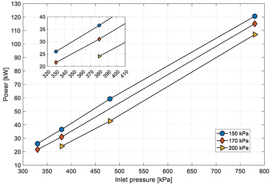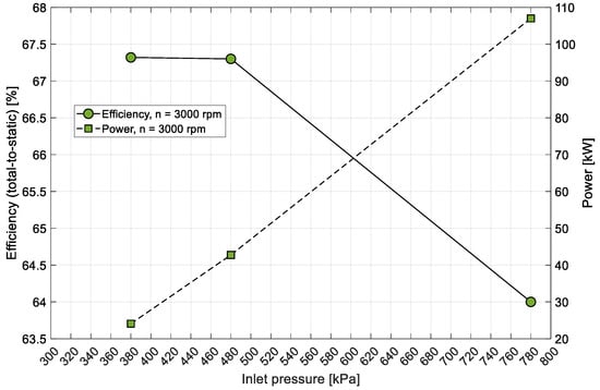 Comparison of efficiency and power output at varying inlet pressures.