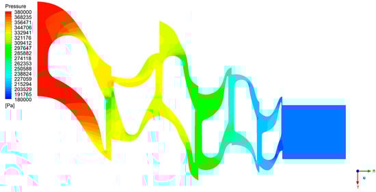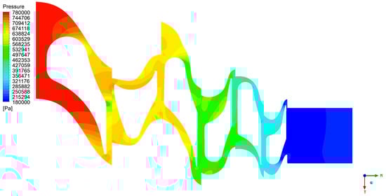 Figure 24 demonstrates that at an inlet pressure of 380 kPa, the aerodynamic expansion process is less intense. The gradual pressure gradient observed from the inlet to the outlet indicates that the flow is relatively stable, with lower aerodynamic forces acting on the rotor blades. The diminished aerodynamic loading on the blade surfaces minimizes the potential for flow separation or recirculation zones, thereby promoting a more laminar flow behavior. In contrast, Figure 25, which depicts a significantly higher inlet pressure of 780 kPa, demonstrates a markedly stronger aerodynamic process. The steeper pressure gradient from the inlet to the outlet highlights the rapid acceleration of the working fluid as it passes through the turbine. The high-pressure difference across the blade passages creates stronger aerodynamic forces, driving a more intense expansion process. Consequently, the working fluid experiences significant increases in velocity and kinetic energy. This results in higher Mach numbers and enhanced flow acceleration, characteristics typical of turbines operating under high-loading conditions. It should be noted that the aforementioned conditions result in elevated levels of aerodynamic losses, predominantly due to an increase in exit velocity losses.