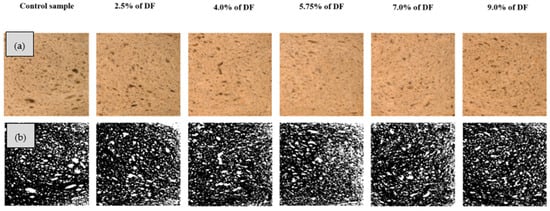 (a) The authentic and (b) binary structure images of bread crumbs with 0% (control sample), 2.5%, 4.0%, 5.75%, 7.0%, and 9.0% of oat DF content, respectively.