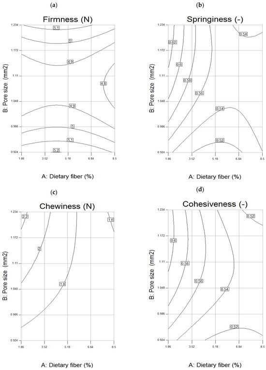 The chewiness model was significantly influenced by DF, pore size, and porosity, as well as the interactions between DF–pore size and pore size–pore density. Such behavior could be explained by how chewiness is determined as a multiplied result of firmness, cohesiveness, and springiness. However, this model was still well-fitted (R2 = 0.937).