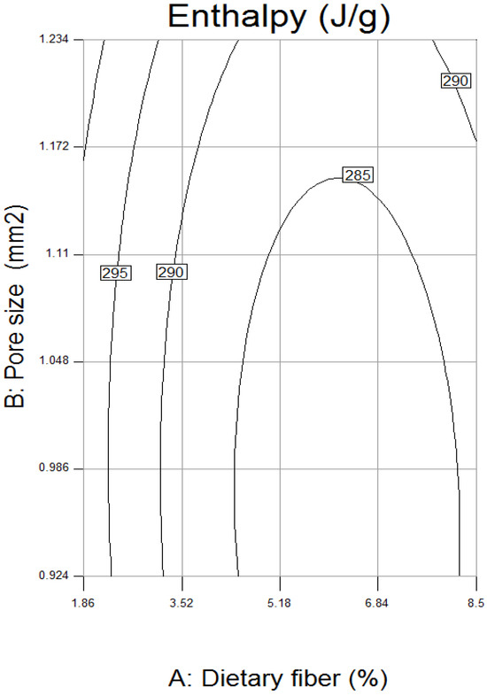 Enthalpy could be regarded as a measure of starch retrogradation. Staling is a complex aging phenomenon characterized by physical and chemical changes in the crust and the crumb. The retrogradation of starch generally causes crumb staling. Retrogradation is the back-formation of the gelatinized starch into a crystallized structure, which results in a reduced water binding capacity [43]. In the present study, we calculated the model of enthalpy values, which decreased with increasing DF content (Table 1). However, the most significant factors were pore size and the interaction between DF and pore density (p ≤ 0.05) (Figure 3). Retrogradation of starch was lower in the samples with beta-glucan fiber, which is consistent with previous studies [27]. These lower values are due to the limiting of water by beta-glucan, which creates an environment for starch crystallization and retrogradation [44].
