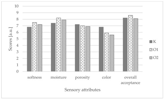 To verify the models, the consumer acceptance of the control sample (K) was compared with the optimized sample with 2.22% DF (O1) and 6.80% DF (O2) (Figure 4).