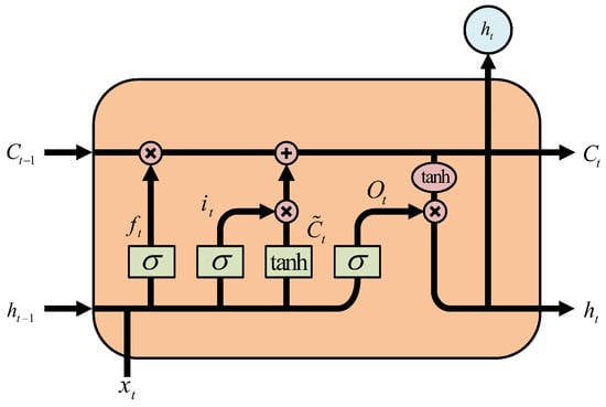 The LSTM cell incorporates three gating mechanisms: the forget gate, the input gate, and the output gate. The role of the forget gate is to determine whether information should be discarded or retained in the cell state, based on the hidden state from the previous time step and the current input. The input gate consists of a sigmoid layer and a tanh layer. The sigmoid layer decides which values to update, and the tanh layer generates a new vector of candidate values for updating the cell state. The output gate determines the value of the next hidden state. The interaction of these three gates enables LSTM to efficiently capture long-term dependencies in time series data while mitigating the effects of noise. The LSTM unit is depicted in Figure 3. The mathematical representation of the LSTM is presented below.