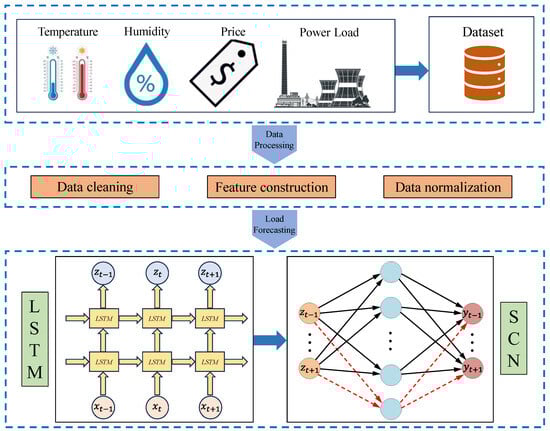 The LSTM-SCN model proposed in this paper consists of two main components: the LSTM, which acts as a feature extractor, and the SCN, which performs load forecasting using these features. The structure of the model is illustrated in Figure 4.