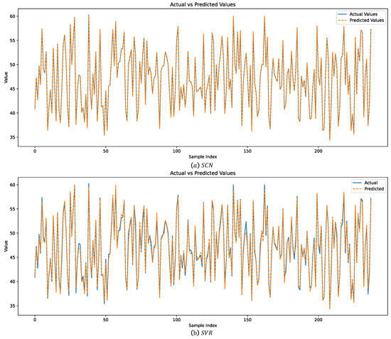 In this section, we use the sigmoid activation function for the SCN, RVFL, and FC models. The parameter settings for each model are as follows [30]: for the FC model, we set the number of iterations to 200 and specify 200 nodes in the hidden layer. For the RVFL model, we also set the number of iterations to 200 and use 200 hidden nodes. For SVR, we determine the optimal parameter combinations through a grid search method, and then apply these optimal parameters to perform regression analysis. For GBRTs, we set the number of trees to 200.
