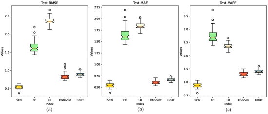 Figure 6 presents the box plots of the RMSE, MAE, and MAPE results for each model over 50 experiments, as shown in Figure 6a–c. Due to poor performance, the RVFL results are not displayed. The plots show that the SCN consistently achieves the lowest values across all metrics, indicating superior predictive accuracy and strong stability with an approximately symmetric distribution of its values.