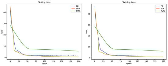 Among all the models, the SCN, FC, and RVFL require iterative training to achieve optimal performance, and these three models are commonly used in hybrid electric load forecasting models. Therefore, we compared the training errors of the SCN with those of FC and RVFL. Figure 7 illustrates the error plots for the SCN, FC, and RVFL on the training and testing sets. The SCN model optimizes its network structure by progressively increasing the number of hidden layer nodes, where each addition of a hidden node corresponds to a training iteration. Therefore, for the SCN, the x-axis represents the number of hidden layer nodes. The experimental results indicate that the SCN and FC models exhibit roughly comparable convergence speeds during training, but the SCN achieves a lower loss function value at the end of training. This suggests that the SCN is more effective in finding the optimal network structure. In contrast, while the RVFL model has a simpler training process, it converges more slowly and ends with a higher loss function value than the SCN and FC models.