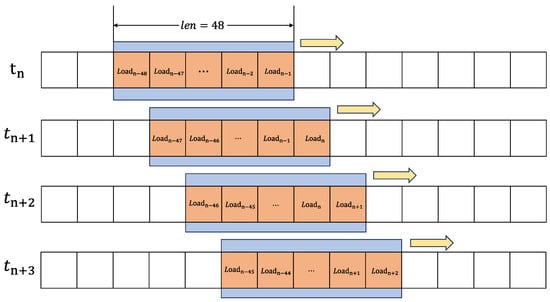 It is recognized that power load data exhibit significant time series characteristics and interdependence between neighboring data points. Therefore, in addition to selecting environmental factors such as weather and humidity as features, we employ a sliding window method to construct features from the power load data. Specifically, we define a sliding window of 48 time units [28] that moves step by step along the time series. Consequently, the feature vector at each time point includes data from the previous 48 time units, capturing the dynamic changes in the historical data at that point. This process is illustrated in Figure 8. For instance, the feature vector for the nth data point is . Using the sliding window method to construct features enhances the model’s ability to capture temporal dependencies and reveals potential patterns and trends in the data. This approach provides richer and more accurate feature information for electricity load forecasting. The feature vectors for the first 48 data points are incomplete due to missing values within the sliding window. Therefore, we remove the first 48 records from the dataset after feature construction to prevent any potential impact of these missing values on subsequent data analysis and model training. The 48 load features we constructed, combined with factors such as weather and humidity, result in a total of 55 features for each electricity load value.