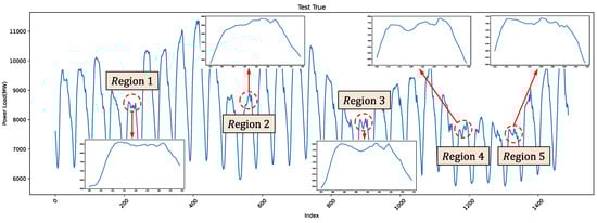 In the field of electricity load forecasting, while most models achieve good forecasting performance in low-volatility regions, their true performance is often revealed in high-volatility regions. To fully evaluate LSTM-SCN’s performance, we selected five high-volatility periods from the last month of the test set, each with 40 data points. Figure 9 and Table 6 detail the selection of these regions and their data ranges, respectively. This detailed analysis enables us to more accurately assess the model’s applicability and accuracy in real-world scenarios with high volatility.