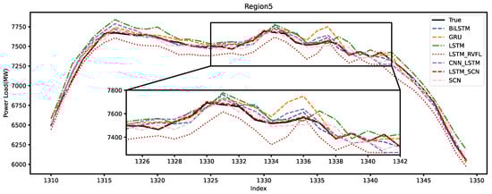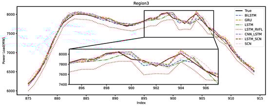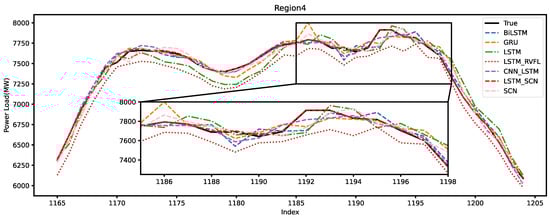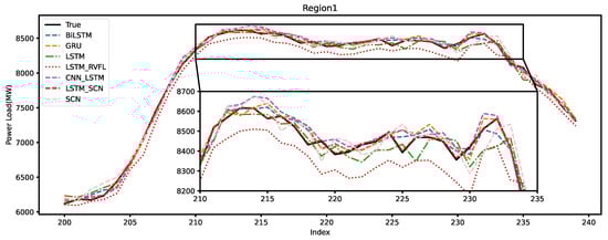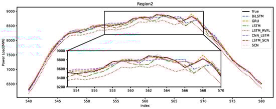 Figure 10 illustrates the forecasting performance of each model in Region 1. In the forecast plots for Region 1, the LSTM-RVFL model exhibits a significant deficiency in forecasting performance compared to other models. The data in this region are highly volatile, which results in most models being unable to accurately predict the changing trend of the power load at the turning points. However, the LSTM-SCN model effectively captures the changes in power load, with its predicted curve closely matching the actual curve.