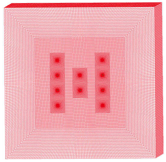 In order to eliminate the influence of reflected stress waves at the boundaries on the calculation, non-reflective boundaries were applied to the six faces of the model. The model had 667,600 grids, as illustrated in Figure 2, generated through the mapping grid partitioning method. The unit of measurement was g-cm-μs.