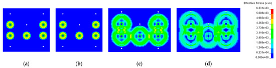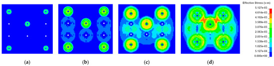 Effective stress cloud map of shallow hole blasting at different times: (a) t = 70 ms; (b) t = 110 ms; (c) t = 150 ms; (d) t = 200 ms.