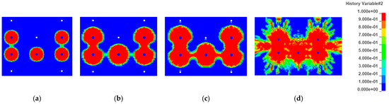 Cloud map of shallow hole blasting damage at different times: (a) t = 110 ms; (b) t = 170 ms; (c) t = 200 ms; (d) t = 240 ms.