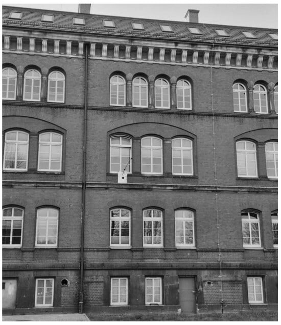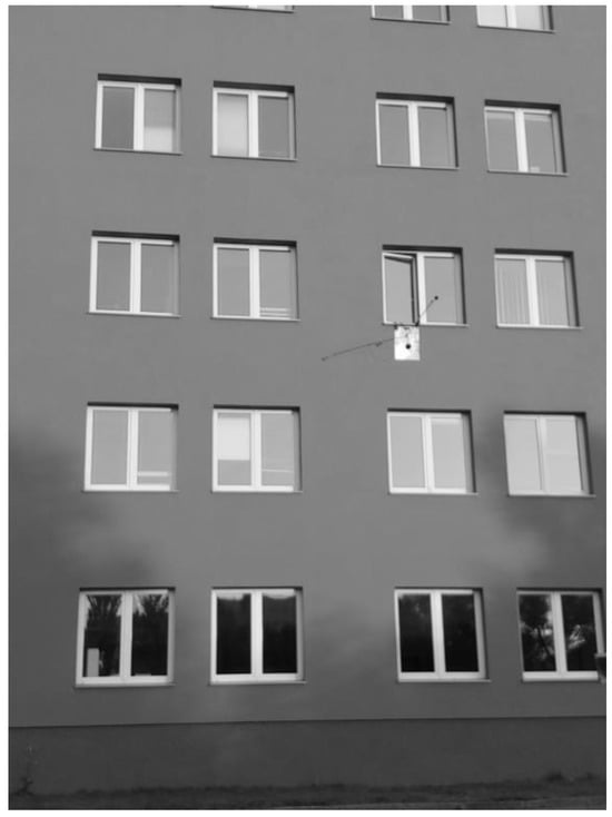 This study was conducted at three buildings (A, B, C) located outside the center of a medium-sized town in the northern part of Poland. The selected buildings have different exterior façade claddings. Building A (Figure 1) has a façade made of clinker bricks. Clinker bricks usually have a volumetric density of 1.5 to 2.0 kg/m3.