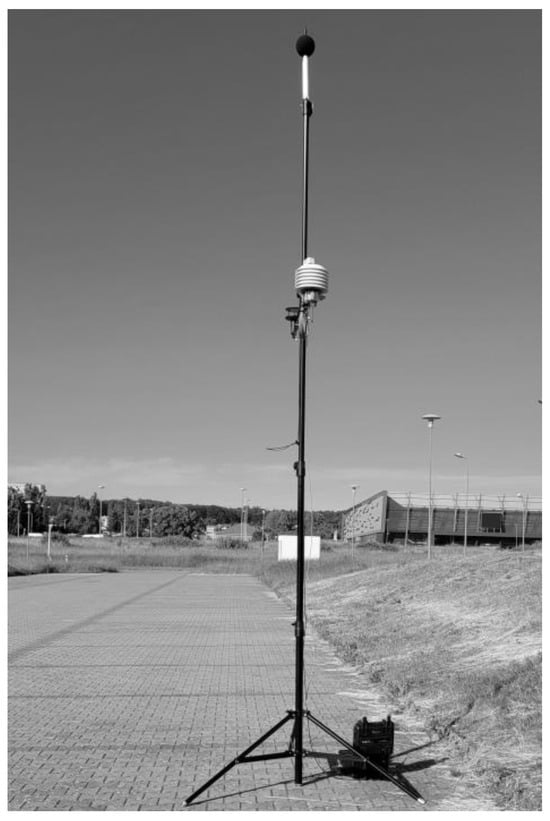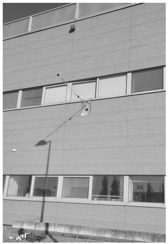 A portable, foldable measurement stand was designed to facilitate noise assessments both on and near a building façade, irrespective of the height of measurement. The stand was required to support simultaneous measurements directly on the façade (at distances ranging from 0.5 m to 2.0 m) and at a distance of 3.0 m away from the façade. A more detailed description of the stand can be found in []. A schematic diagram of the stand is shown in Figure 7. The stand’s frame is constructed from a 5 mm thick aluminum plate measuring 0.5 × 0.7 m, to which a horizontal mast is secured. The mast is composed of two thin-walled pipes with a diameter of 20 mm, connected using sockets. Microphone holders, which can be adjusted and positioned along the mast, are mounted on the pipe.