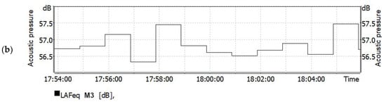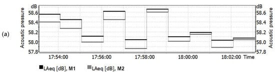 Measurements at the building façade were conducted at two heights of 2 m and 6 m from the ground, mounting microphones on a portable measuring mast []. The fifth measurement point was fixed and located 4 m above the ground at a distance from the vertical reflecting surfaces. Bearing in mind the guidelines from Appendix B of the standard [], it can be concluded that microphones M2 and M2F 3 m away and M3 50 m offset from the building façade were in the free sound field.