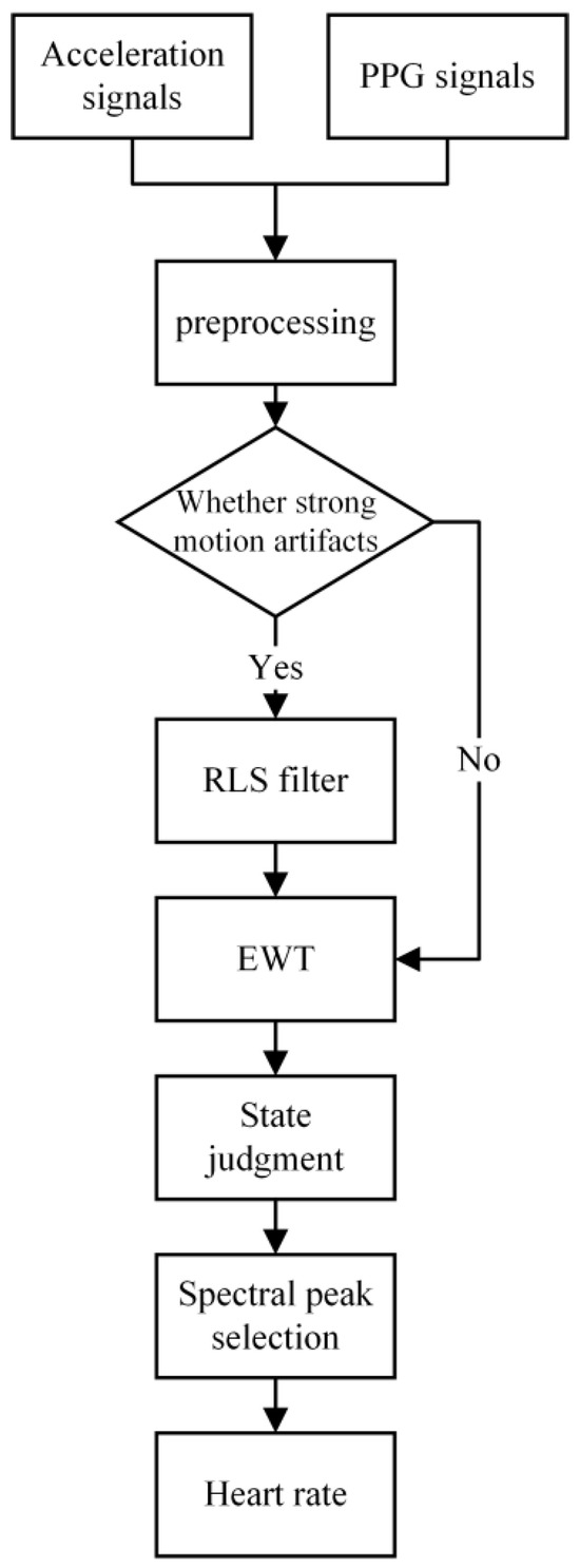 In order to reduce the influence of motion artifacts and improve the accuracy of heart rate estimation, this algorithm adds RLS filtering and EWT for denoising on the basis of the FSM framework while incorporating adaptive spectral peak tracking. The comparison results from the public dataset and the self-measurement dataset show that the algorithm in this paper further improves the accuracy of heart rate calculation and has a certain degree of anti-interference ability. Compared with other algorithms, this paper’s algorithm improves the stability of the algorithm by introducing the FSM to evaluate the reliability of the historical heart rate and selecting appropriate heart rate search rules for each state. Although our algorithm has some advantages in computational accuracy and anti-interference, it still has some limitations. First, the PPG signal is susceptible to random noise introduced by ambient light and other electromagnetic interference signals during the acquisition process. Furthermore, the placement of the sensor can also have an impact on the quality of the PPG signal because of the differences in sensitivity to the volumetric fluctuations of blood in different parts of the body [20]. All these factors affect the performance of the algorithm. To address these challenges, future research can improve the sensor design in terms of hardware, as well as optimize the preprocessing process of the algorithm to suppress noise more effectively and improve the robustness of the algorithm. Furthermore, while FSM enables the algorithm to better adapt to motion artifacts of varying degrees, it has inherent limitations due to its reliance on historical values. This reliance may result in insufficient adaptability when encountering unknown or unpredictable scenarios. Therefore, further testing with more diverse datasets is crucial to assess the algorithm’s performance across a broader range of real-world conditions. In future work, we plan to enhance data diversity by incorporating scenarios such as office and daily life activities. We will also collect data from various age groups, genders, and body types to ensure the algorithm’s robustness. Additionally, introducing more state transition conditions to handle various situations and employing more complex models, such as advanced neural networks, could help extract richer data features and enable the algorithm to adapt more effectively to different situations.