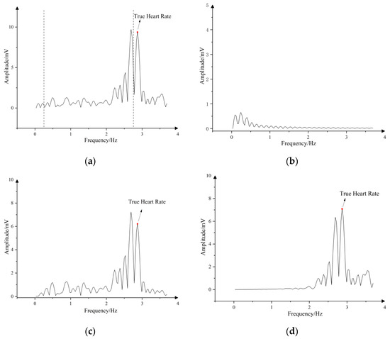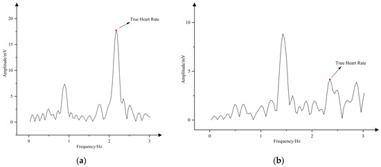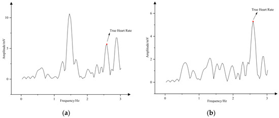 If it is larger than the threshold value (), it is determined as a strong MA; otherwise, it is a weak MA. As shown in Figure 2, the two plots represent the weak and strong motion artifacts, respectively. It is obvious from the figure that when the motion artifact is weak, the peak of the true heart rate is more prominent and is the dominant peak. On the contrary, under the strong motion artifacts, the amplitude of the peak of the true heart rate is significantly smaller than the amplitude of the MA peak, which is affected by the MA.