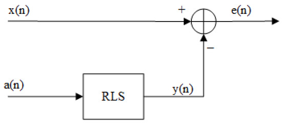 When it is a strong MA, the signal is first denoised by RLS filtering. Adaptive filtering minimizes the difference between the reference signal and the input signal by continuously and iteratively adjusting the parameters of the filter. Here, the and in Section 2.1 are taken as the reference and input signal , respectively. The estimated MA signal is , the error signal is , and the framework is shown in Figure 3. The parameters of the RLS are set as follows: order N = 55, forgetting factor λ = 0.999, and initialized covariance estimate ϴ = 0.1.
