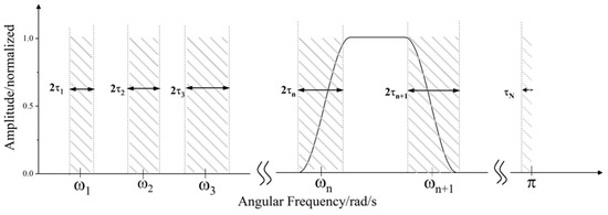 Considering the periodicity of 2π and Shannon’s criterion, the Fourier spectrum ω is restricted to 0–π. [0, π] is divided into N segments, and each segment is defined as Λn = [ωn−1, ωn]. Centered on ωn, the length of the transition intervals in each band is 2τn. The empirical wavelet transform can be defined as a set of band-pass filters in the frequency bands, as shown in Figure 5: