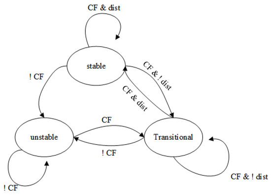 The state transition rules of the FSM are shown in Figure 7. If , the CF condition is satisfied. If , the dist condition is satisfied. When the previous state is a stable state, then judge whether CF and dist of the current window satisfy the condition. If both are satisfied, then the stable state is maintained. If CF satisfies but dist does not, then it will be a transitional state. If CF is not satisfied, then it will be an unstable state. When the previous state is a transitional state, if both CF and dist are satisfied, then it is a stable state. If CF is satisfied but dist is not satisfied, then it remains a transition state. If CF is not satisfied, then it is an unstable state. When the previous state is unstable, the estimated heart rate in this state is not reliable; at this time, only the CF needs to be judged. If CF satisfies the condition, then it is a transition state; otherwise, the unstable state should be kept.