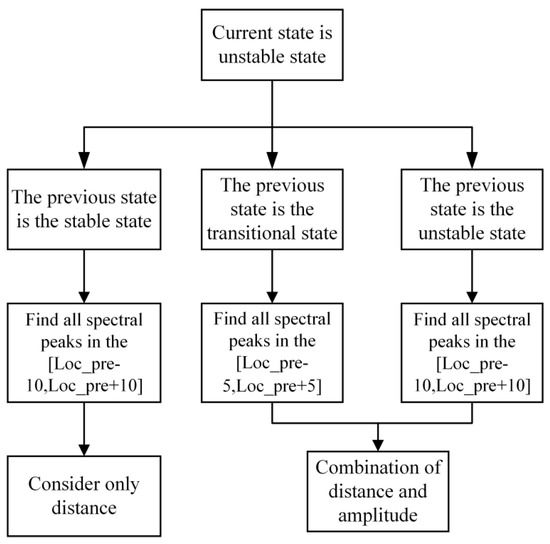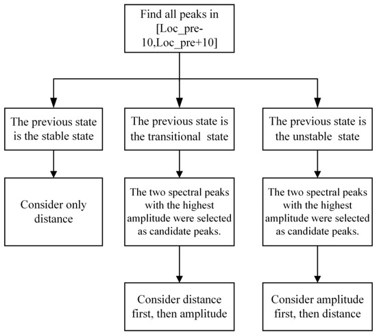 The CF condition and distance condition of the signal in the unstable state are not satisfied, and the two factors of distance and amplitude should be considered as comprehensively as possible when performing the screening of spectral peaks. The corresponding framework is shown in Figure 9. When the state of the previous window is a stable state, all the spectral peaks are found in the interval of , and the position of the spectral peak closest to Loc_pre is found as the position among all the spectral peaks. When the last window is a transitional state, all spectral peaks are found in the interval of , and when the last window is an unstable state, the filtering interval is , and then the peaks are selected with reference to the method of integrating the amplitude and distance mentioned in the literature [15]. All the magnitudes are first normalized by dividing the maximum value, and then the proximity C(k) of each spectral peak is calculated based on the distance:
