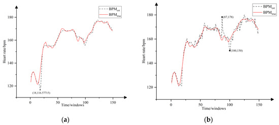 Some of the algorithms using the same dataset in the public dataset were selected for comparison, and the results are shown in Table 1. As a whole, the heart rate results calculated by the algorithm in this paper have an MAE of 0.93 bpm and a MAPE of 0.77%. Compared with other algorithms, this method demonstrates a higher level of accuracy. From the statistical results, it can be seen that all the algorithms have the worst results in the tenth dataset, in which the better performance of WFPV has a MAE of 2.06 bpm on this dataset, while the MAE of this paper’s algorithm is 1.41 bpm. WFPV achieves denoising through Wiener filtering and refines the spectrum using a phase vocoder, which enhances the precision of spectral analysis and improves calculation accuracy. From Figure 11b, it can be seen that the algorithm shows better tracking in the early stage, but the calculation results in the 87th and 100th windows, which are strongly influenced by MA, deviate more. As shown in Figure 11a, the proposed algorithm removes the outliers as well as smoothes the curves through post-processing so that the heart rate in the vicinity of these two windows does not differ much from the true value, and the heart rate information can be better captured, even though a large deviation from the true value occurs in the 18th window, which is in an unstable state due to significant motion artifacts. However, the algorithm employs adaptive spectral peak tracking, considering both the distance factor and spectral amplitude, enabling the tracking to quickly return to the true value. This reduces the long-term impact of motion artifacts on heart rate estimation, ensuring that the algorithm maintains high accuracy and stability even in dynamically changing environments. The proposed algorithm not only achieves higher overall accuracy but also demonstrates superior robustness in scenarios with significant motion artifacts.