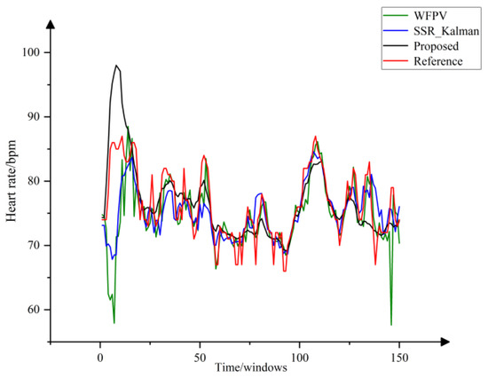 In the self-test dataset, the open-source algorithms WFPV and SSR_Kalman were selected for comparison, and the comparison results are shown in Table 2. From the calculation results, the MAE of this paper’s algorithm is the smallest, and the MAPE is slightly higher than that of SSR_Kalman. The WFPV algorithm demonstrates significant advantages in periodic motion scenarios but lacks robustness, resulting in poorer performance on certain datasets. The 8th data set with the largest error in the calculation results of the algorithm in this paper is selected for comparison, as shown in Figure 12. Locally, WFPV and SSR_Kalman have better tracking. However, the proposed algorithm in this paper more effectively captures the overall trend of heart rate changes and maintains higher robustness in long-term heart rate estimation. This is due to the combination of adaptive spectral peak tracking and FSM, which help mitigate the effects of motion artifacts. Even in the presence of large motion artifacts or noisy data, it provides a more reliable representation of heart rate trends. Therefore, the proposed method provides more comprehensive and stable heart rate estimation in practical applications.